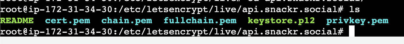 - cert.pem , chain.pem , fullchain.pem , privkey.pem 존재를 확인한다.