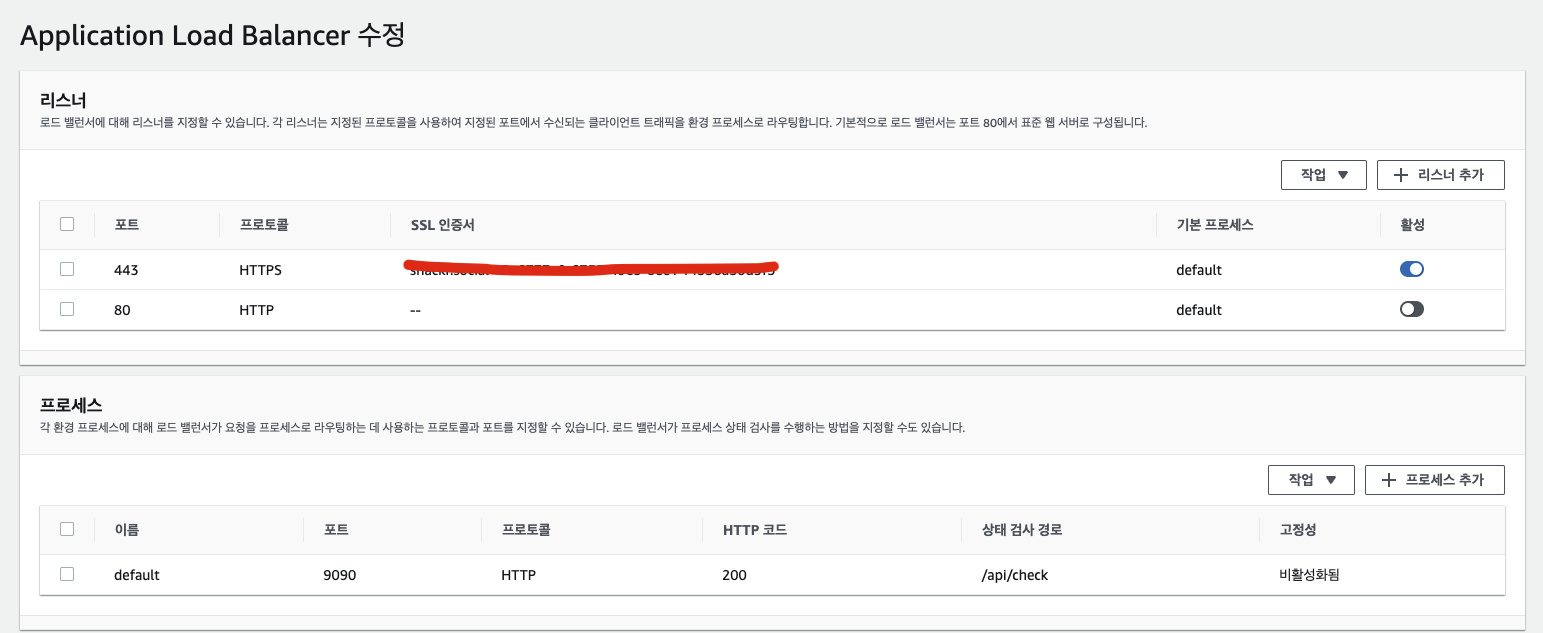 외부에서 들어오는 포트에 대한 설정이라고 생각하면 된다. 그림을 보면 HTTPS 443 포트만 활성화 시켜두었고 HTTP 80 포트는 비활성화 시켜놨다.